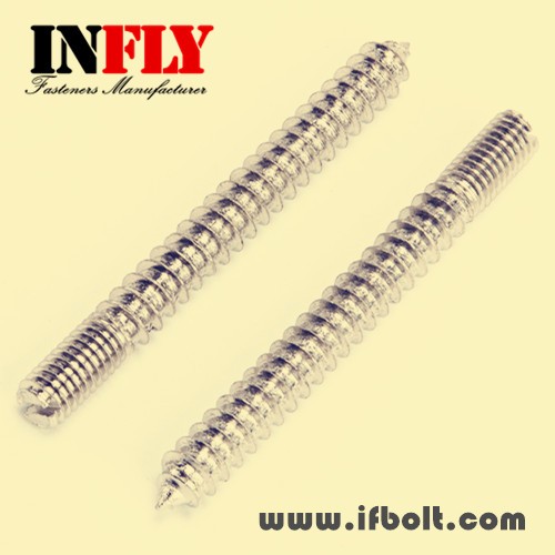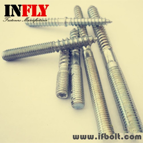 Machine & wood double thread bolt is the one side of the machine threaded and one side of wood threaded boltw, also known as stud wood screws and stud bolt, there is no specific reference standard in the international and domesticGenerally according to the specific requirements of customers to order, sometimes will be required with a hexagonal in the middle, so that to hexagon wrench or tools locking, sometimes will also be required to end with a slot or torx. Available in Stud bolt: 6*40/50/60/70/80/90/100/120/150 8*50/60/70/80/90100/110/120/130/140/150/160/180/200/220 10*50/60/70/80/90/100/110/120/130/140/150/160/180/200/220 12*100/120/140/160/180/200 Material: class 4.8, carbon steel Q195, 1008 Surface: white zinc, yellow zinc, blue zinc, H.D.G. Packing: 20KG-25KG/carton and then on pallet.