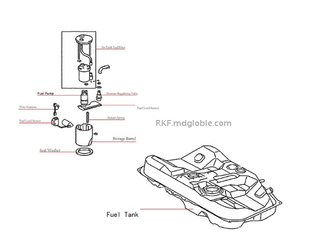 Fuel pump assembly consists of fuel pump, carbon tank, primary strainer, filter, storage barrel, spring, fuel level sensor, connecting pipe, rollover valve, pressure regulator, flange plate, bracket etc. All components are connected by corrugated pipe and other seal parts.