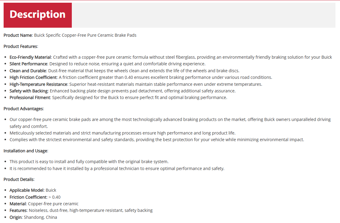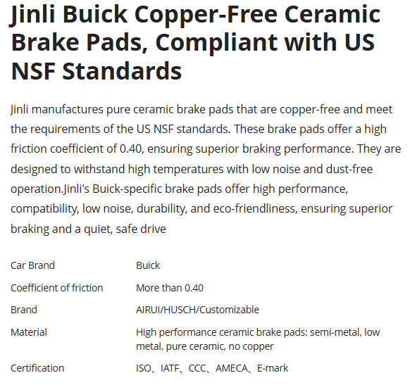 Supplier Homepage Jinli Buick Copper-Free CeramicBrake Pads,Compliant with USNSF Standards