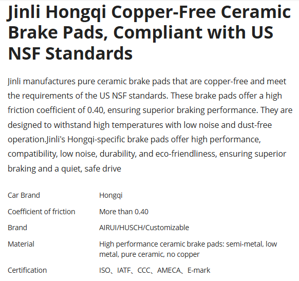 Supplier Homepage Jinli Hongqi Copper-Free CeramicBrake Pads,Compliant with USNSF Standards