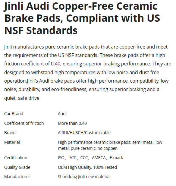 Supplier Homepage Jinli Audi Copper-Free CeramicBrake Pads,Compliant with USNSF Standards