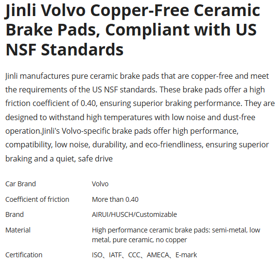 Jinli Volvo Copper-Free CeramicBrake Pads,Compliant with USNSF Standards