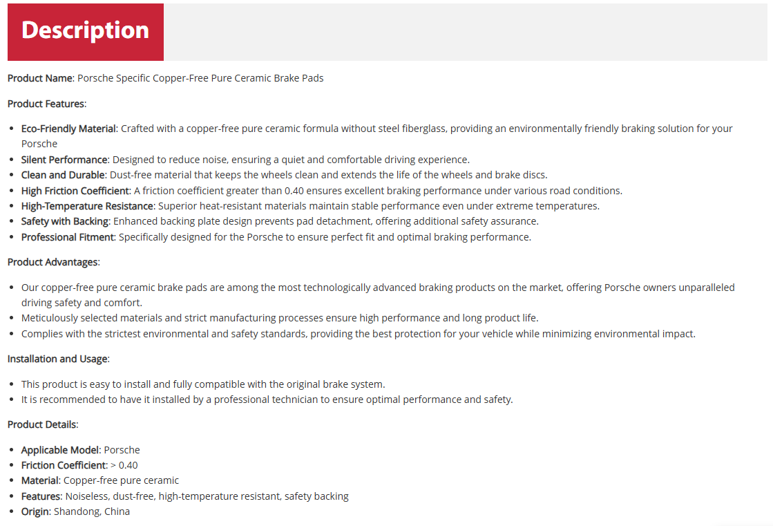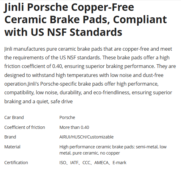 Supplier Homepage Jinli Porsche Copper-Free Ceramic Brake Pads,Compliantwith US NSF Standards