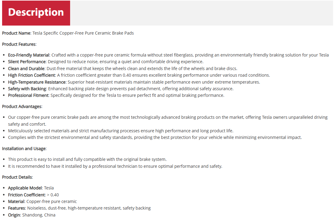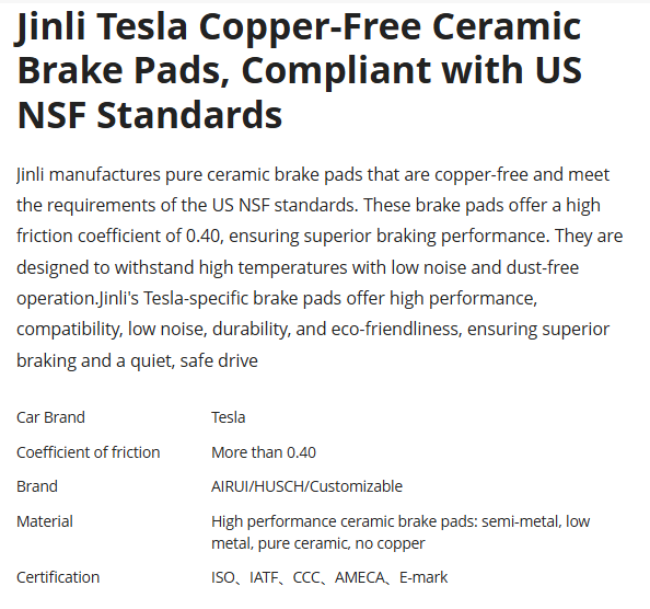 Supplier Homepage Jinli Tesla Copper-Free CeramicBrake Pads,Compliant with USNSF Standards