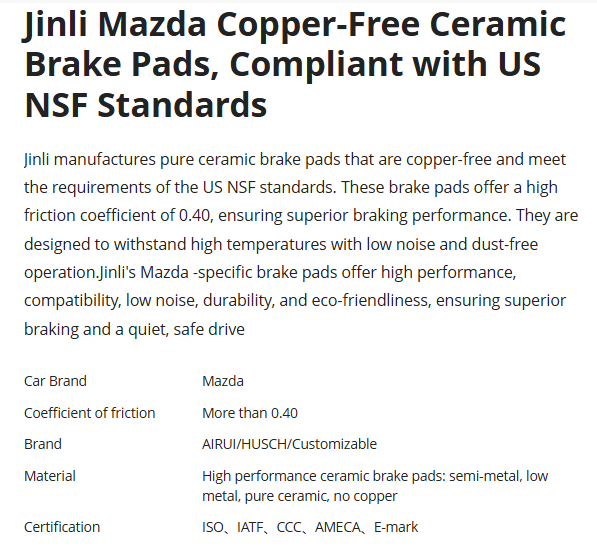 Jinli Mazda Copper-Free Ceramic Brake Pads, Compliant with US NSF Standards