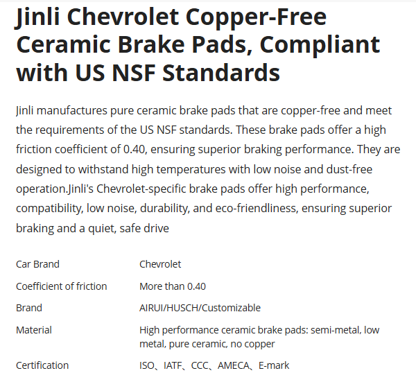 Jinli Chevrolet Copper-Free Ceramic Brake Pads, Compliant with US NSF Standards