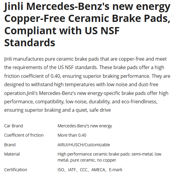 Jinli Mercedes-Benz's new energy Copper-Free Ceramic Brake Pads, Compliant with Us NSF Standards