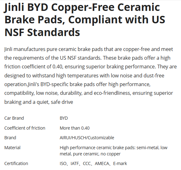 Jinli BYD Copper-Free Ceramic Brake Pads, Compliant with US NSF Standards