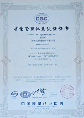 Companies in the industry taking the lead through the ISO9001: 2000 quality system certification, the automotive chain product passed ISO / TS16949 quality system certification. The company's testing center has been approved for use ISO / IEC17025 standard test ability related quality inspection agency and was recognized as the national secondary level units of measurement, the center has a 10,000 rpm / min automatic frequency of high-speed wear test bench, high-frequency fatigue testing machine advanced test equipment, testing means complete. Over the years the company's production of "Rui lion card" chain with excellent quality and perfect service has won praises from users. Over the years by a number of supporting plant as "Excellent Supplier" and "free products." "Rui Lion" trademark was awarded China Famous Brand, Huzhou City famous trademark. "Rui Lion" brand was rated as Zhejiang famous brand chain, Huzhou City brand.