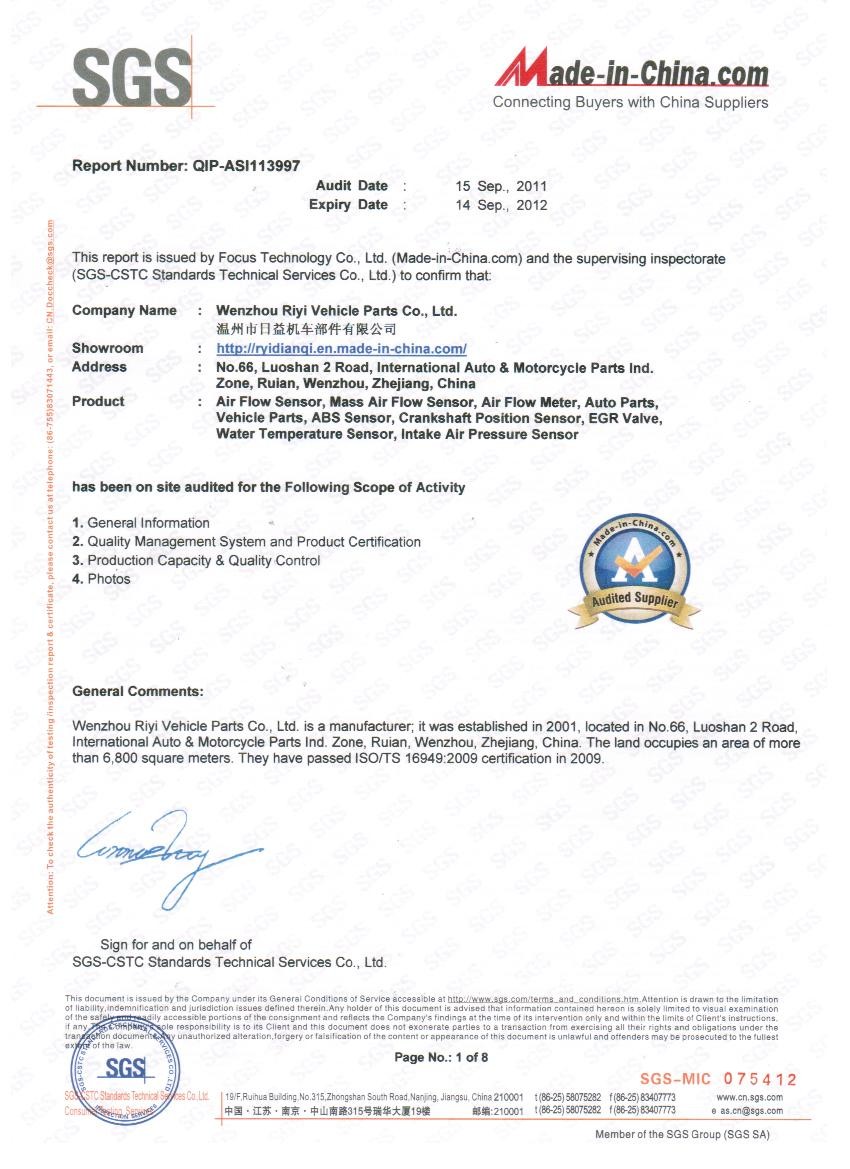 Wenzhou Riyi Vehicle Parts Co.,Ltd is a technological enterprise specializing in researching, developing and manufacturing the Air Flow Meter, Crankshaft Position sensor, Water Temperature sensor ,ABS sensor,Camshaft sensor,Throttle Position sensor,Knock sensor,MAP sensor ,EGR valve and Blower Regulator series.
