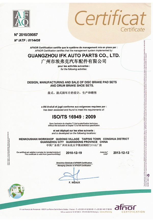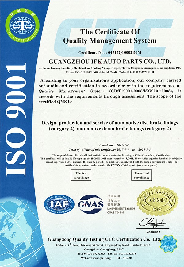 IFK has devoted itself to delivering excellent OE quality brake pads and professional customer service to the worldwide market, such Russia, Ukraine, Netherland, Turkey, Georgia, Algeria, Tunisia, Morocco, USA, Thailand, Bolivia... and so on, with the product range from European, Japanese to American, Korean and Chinese car model.