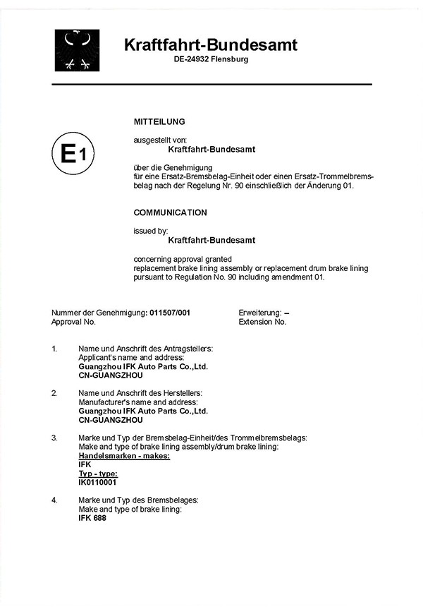IFK Brake Pads are manufactured and supplied under ISO/TS16949 certifications to ensure the highest level of quality, safety, and reliability. IFK Brake Pads' quality is tested and approved under a number of certifications, which include ISO9001:2015 and E-Mark ECE R-90 which is required by the European Union and other countries that have adopted to ECE regulations.