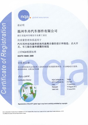 We have passed ISO16949: 2009 international quality system certification, ISO14001: 2004 environmental management system certification and OHSA18001: 2001 occupational health and safety management system certification. We have won honors such as national high-tech enterprise, Zhejiang’s patent model enterprise, Class A customs-administered enterprise, Wenzhou’s famous product, Wenzhou’s famous export brand and bank-rated 3A enterprise.