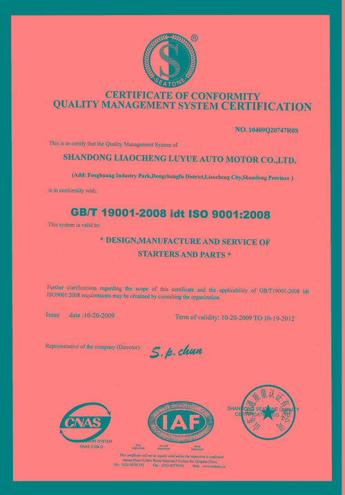 In respect of production quality, standing on the stage of international competition, to improve product quality and enhance enterprise competitiveness,our company has introduced advanced production and test equipment used for key processes.Such as Starter Performance Tester, Armature winding forming automatic machine, Armature winding automatic insertion machine, Armature winding automatic welding machine, armature winding automatic engraving machine, Armature winding automatic Precision machine, Magnetic coil automatic immersion machine, armature automatic immersion machine and so on. The investment in production and test equipment effectively ensure quality of products.At the same time, we also upgrade quality management system. In 2009, our company carried on upgrade of ISO9001-2008 version Every working procedure would be checked strictly, from incoming inspection to Material storage,from manufacture of auto parts to package of products. Products Laboratory make a irregularly random inspection among finished products in storage and perform reliable test by the actual installment.