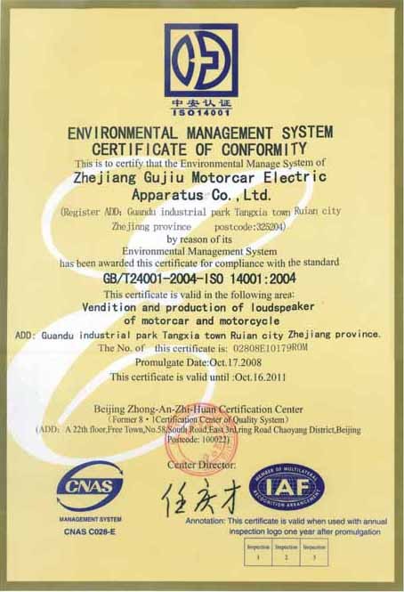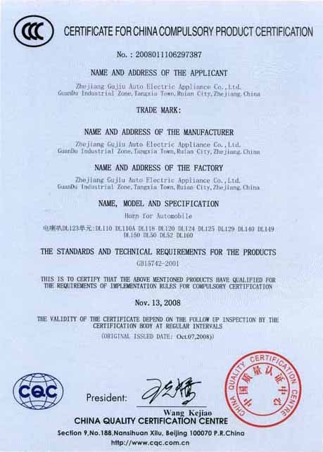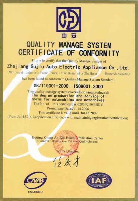 GuJiu Auto Electric Appliance Co., Ltd., a corporate enterprise, was estiblished on 1991. It specializes in production of auto horns. It is also an ISO/TS16949 international quality system authentication enterprise, owing advanced production technology and equipment and scientific management system, perfect customer service system. Through many years of hard woking and developing, the quality and technology of our products are at the leading position in the colleague. The prominent trademark, “Gu Jiu”, wins the majority of users trust and praise with the reliable quality and good after-sales service. GUJIU company has three major series products such as the snail electric horns, disc type electric horns, electric control air horns as the leading. Our products are exported to Europe, America, Middle east and so on.