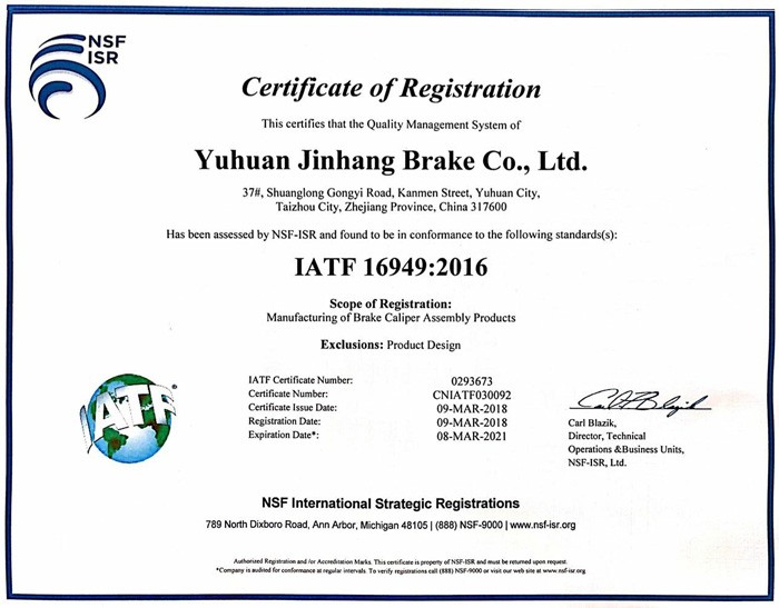 Yuhuan Jinhang brake Co., Ltd. is located in Yuhuan City, Zhejiang Province, which is the famous automobile and motorcycle parts production base in China. Adjacent to Ningbo and Shanghai, it has convenient water, land and air transportation. The company specializes in the production of brake caliper and accessories. At present, there are more than 1000 kinds of products, which not only sell well in the domestic market, but also sell well in Europe and America, and have a high reputation in the industry. After more than ten years of development, the company covers an area of 5000 square meters, and now has a good production environment and relatively perfect management mechanism. Mechanical processing and quality inspection equipment are complete, with the capacity of large-scale production. Now it has passed the quality system certification of iatf16949 (original TS16949). The company emphasizes people-oriented operation, talents and management. There are 120 employees, more than 10 high, medium and professional technicians. Advanced computer management, CAD design, SPC control, MSA analysis and other means are used for product development, production and quality control. We are in the spirit of indomitable, continuous innovation and always pragmatic. Take first-class quality, advanced technology and perfect service as our duty. Jinhang people with great enthusiasm, all staff waiting, welcome customers at home and abroad to visit guidance!