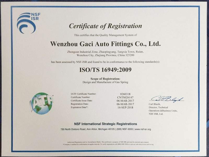 Wenzhou City Gaci Auto Fittings Co.,Ltd is specialized in production, sales, research and development of gas springs. Our main products are lockable gas springs,lift gas springs and vibration dampers,which can be widely applied in the fields such as automobile manufacturing , mechanical hardware, medical equipment, fitness equipment,shipbuilding and so on. With reliable quality, excellent service, we have won the high praise and trust from our customers.