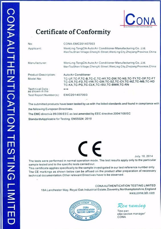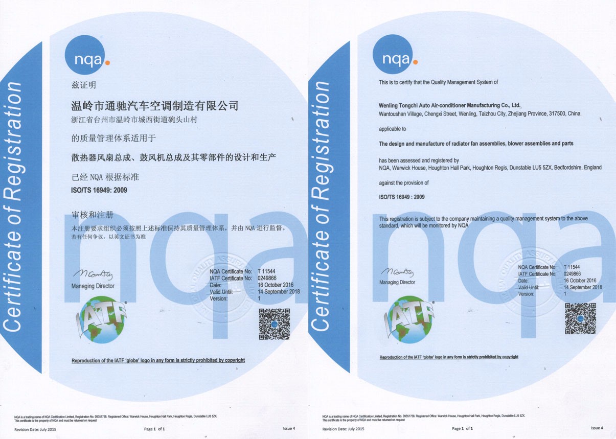 Tongchi Auto Air Conditioner Manufacturing Co., Ltd. was founded in 1998 .Our factory is located in wenling city ,zhejiang province, near from NINGBO prot and SHANGHAI port . Our main products are radiator Cooling fan ,condenser fan and fan motor etc for both OEM and After market for years.