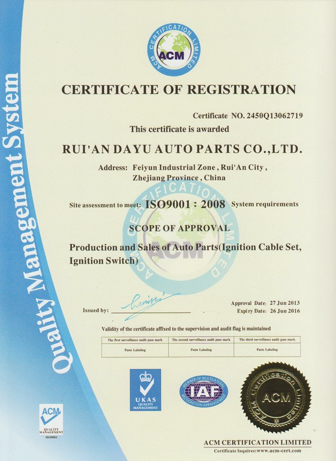Ruian Dayu Auto Parts Co., Ltd., predecessor was Ruiguang Electric Appliances Factory, created in 1993 specialize in the production of ignition cable, ignition coil and Electric switch etc, now we producing ignition cable and cylinder head gasket. We locate in Fengyun town Ruian city as the Capital of Auto & Motor parts in China. We have a strong and professional expert team for inceasing range of our offer and raising its quality. We are able to satisfy almost all needs and requirements of our customers.Preceded by comprehensive range,high quality,reasonale price we serve for our customer all over the world with the belief of “Transcend by conscientious work and great effort of us”!