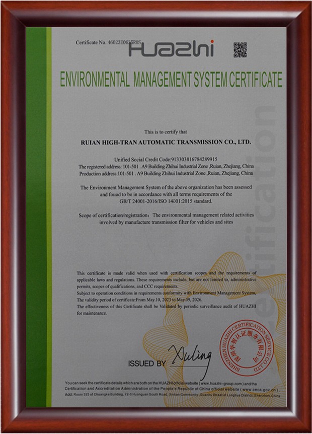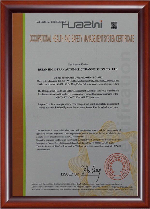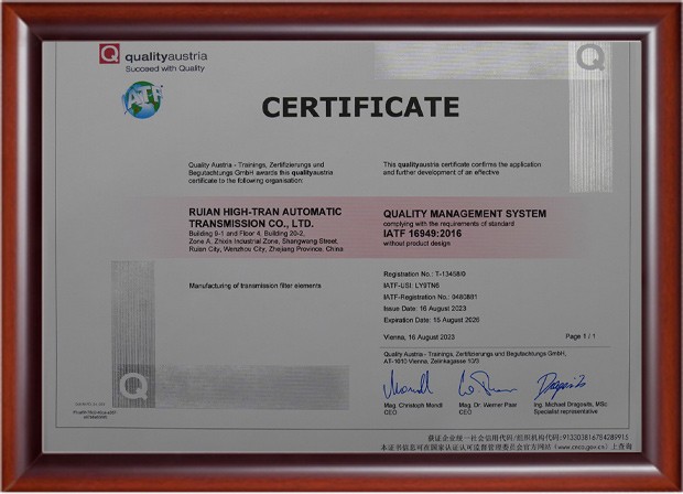 RUI AN HIGH-TRAN AUTOMATIC TRANSMISSION CO.,LTD is a high-tech enterprise specalizing in the production and researchresearch of transmission oil filters,solenoid valves,sensors and connecting wire boards.Our products cover all types oftransmission fiters,with more than 600 models,which are mainly sold to North America,Europe,Southeast Asia,Russia and thedomestic market.The factory covers an area of more than 15000m,and has injection molding machines,punching machines,vibration friction welding machines and laser welding machines for processing and production.Following the principle of“qulty first continuous innovation”and in acordance with the requrements of the IATF16949.14001,and 45001 qualitymanagement certification systems,we serve a wide range of domestic andforeign customers with a rigorous attitude,downto-earth work style and honest business aproach.