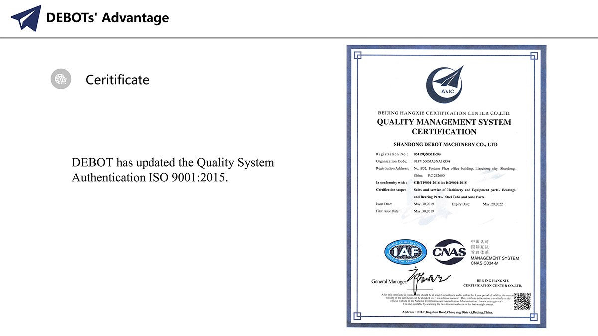 DEBOT Machinery locations in Liaocheng,Shandong province,China. We have recently upgraded to the ISO9001standard quality control system certification. There has sophisticated detecting equipment and experimental equipment and perfect detection technology to provide a reliable guarantee for the production of quality products.