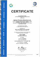 Spintec has been qualified by IATF16949:2016, ISO9001:2015, ISO140012015, World Wide Fund (WWF Hong Kong) Low Carbon Manufacturing Programme. Since 2012, Spintec was awarded by the "Hong Kong - GuangdongCleaner Production Partners Recognition" scheme which demonstrate active participation in cleaner production.