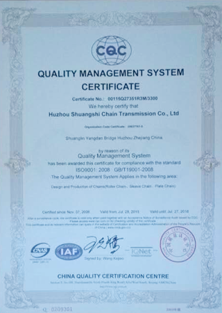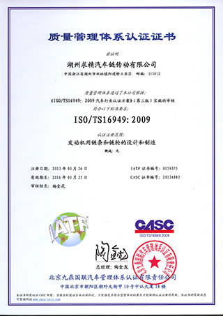 Companies in the industry taking the lead through the ISO9001: 2000 quality system certification, the automotive chain product passed ISO / TS16949 quality system certification. The company's testing center has been approved for use ISO / IEC17025 standard test ability related quality inspection agency and was recognized as the national secondary level units of measurement, the center has a 10,000 rpm / min automatic frequency of high-speed wear test bench, high-frequency fatigue testing machine advanced test equipment, testing means complete. Over the years the company's production of "Rui lion card" chain with excellent quality and perfect service has won praises from users. Over the years by a number of supporting plant as "Excellent Supplier" and "free products." "Rui Lion" trademark was awarded China Famous Brand, Huzhou City famous trademark. "Rui Lion" brand was rated as Zhejiang famous brand chain, Huzhou City brand.
