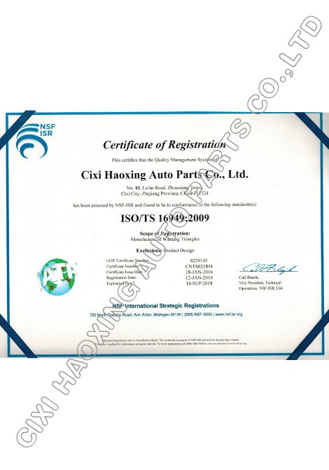 Cixi HaoXing Auto Parts Co.,Ltd.is a manufacturing and exporting factory that specialized in Auto accessories and security and protective spare parts.It is the professional manufacturer of automotive warning triangle and auto safety kits,car ashtray,safety hammer and a series of multi-function security products.,etc.
