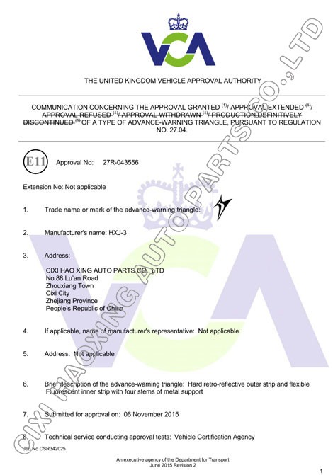 The warning triangle explored by our company according to ECE27R European requirements and we also got cerificate of ISO900,E-MARK,ROHS,CE.