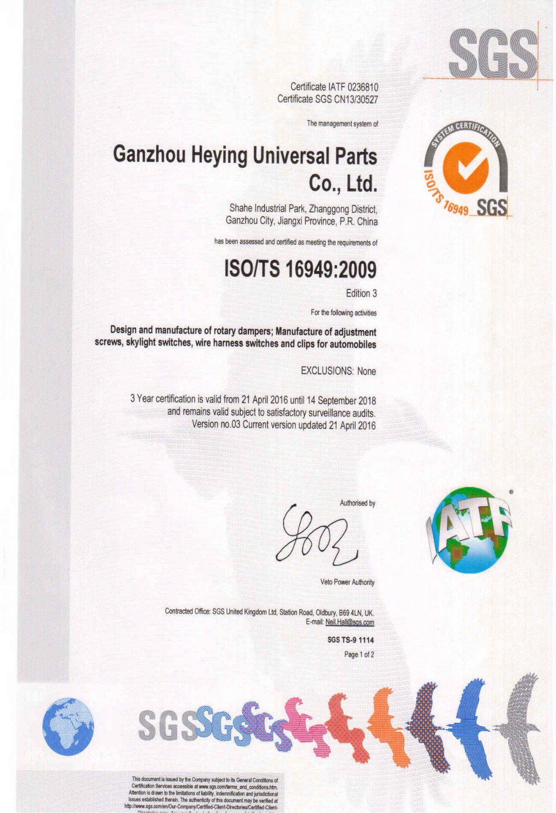 Ganzhou Heying Universal Parts Co. Ltd. is professional company in developing, producing and selling precise plastic parts, auto parts, fasteners, standard parts and delicate plastic mold design and manufacture. It is located in Shahe Industry Park, Zhanggong District, Jiangxi Province; with total area of 6000 square meters; it was established and started operation in January 2012. There are 7 departments in Ganzhou Heying Universal Parts Co., Ltd: marketing dept., R&D dept., mold dept., injection dept., assembly dept., QC dept. and personnel administration dpet.; all raw materials used in the products are RoHs and REACH compliance, and it has passed the certificate of ISO9001 and TS16949 certified by SGS in March 2013. Heying has been mainly manufacturing with 26 series products, with more than 5000 kinds of types in total, and it has more than 3000 sets self-developed tooling.Main products:Universal automotive parts: auto clips, car light switch, automobile wire harness, skylight switch, rotary dampers, auto rivet, and automotive dampers, etc. Plastic fasteners and standard parts: plastic screws and nuts, double colored mixer knobs and push buttons, rotary dampers, nylon rivets, plastic book screws, push door latches, silver and gold stamping foot pads, and all sorts of electric appliance foot pads, etc.
