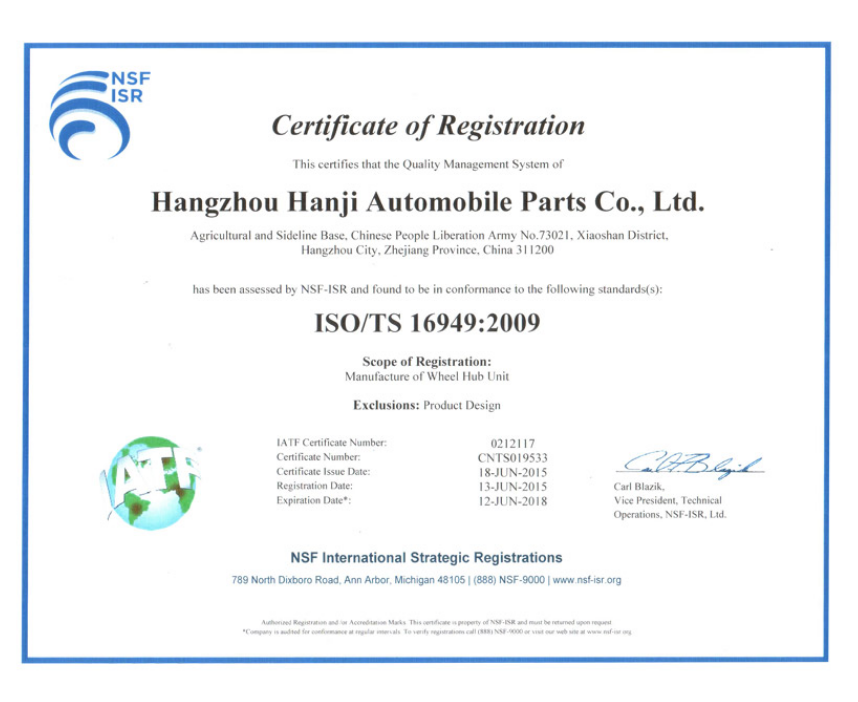 Now we have over 1100 models of wheel hub assemblies and bearings for American cars,Japanese cars,European cars and Korean cars. Except our own products, we provide After-market services and accept customized order as well. Our main market are North America, South America and West Europe. HANJI got certificate ISO/TS 16949:2009 in 2012.