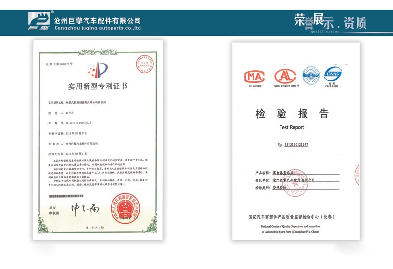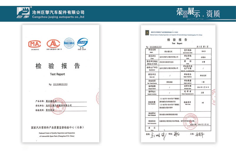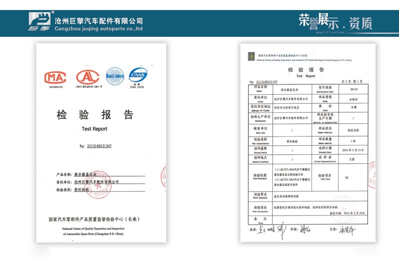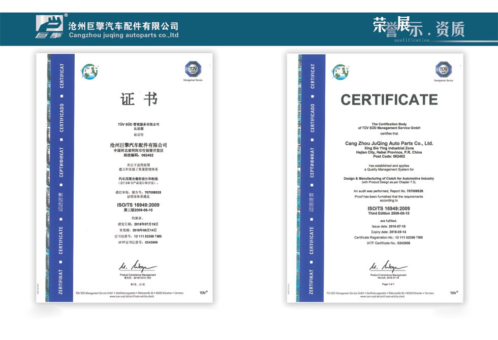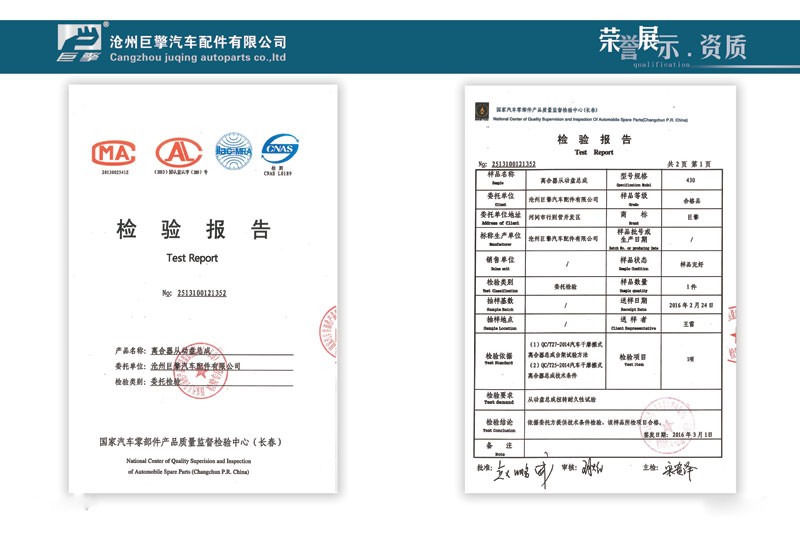 Cangzhou juqing  Auto parts co. , ltd, founded in 2006, is a company with independent design, research and development ability of the large automobile clutch professional manufacturing company, has many years of experience in production of automobile clutch assembly, 2012 named"cangzhou 9th consumer trust units","JUQING" brand clutch was rated "hight-quality products in hebei province" in 2013, and is the only one to be included in the clutch industry enterprises. The company factory clutch assembly passes the computer testing equipment has throughed the strict multiple fuction testing, stable fuction, reliable in quality. In recent years, with the high quality raw materials, advanced prodution testing equipment, exquisite prodution technology, professional production team, our company provides the high-quality ser-vice for the domestic numerous parts distributors, production capacity and technical ability in the domestic leading level, won widespread praise and praise of the industry.