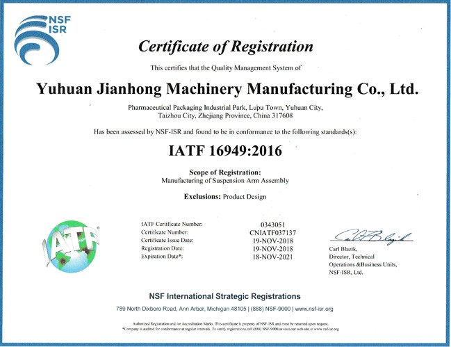 Yuhuan Jianhong Machine Manufacture Co.,Ltd. is located in Xuanmen industrial Zone, Yuhuan, Zhejiang, China. It's a professional suspension arm manufacturer which established in 1998.