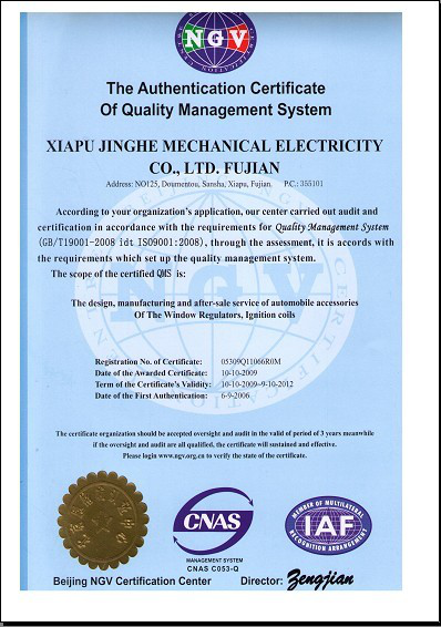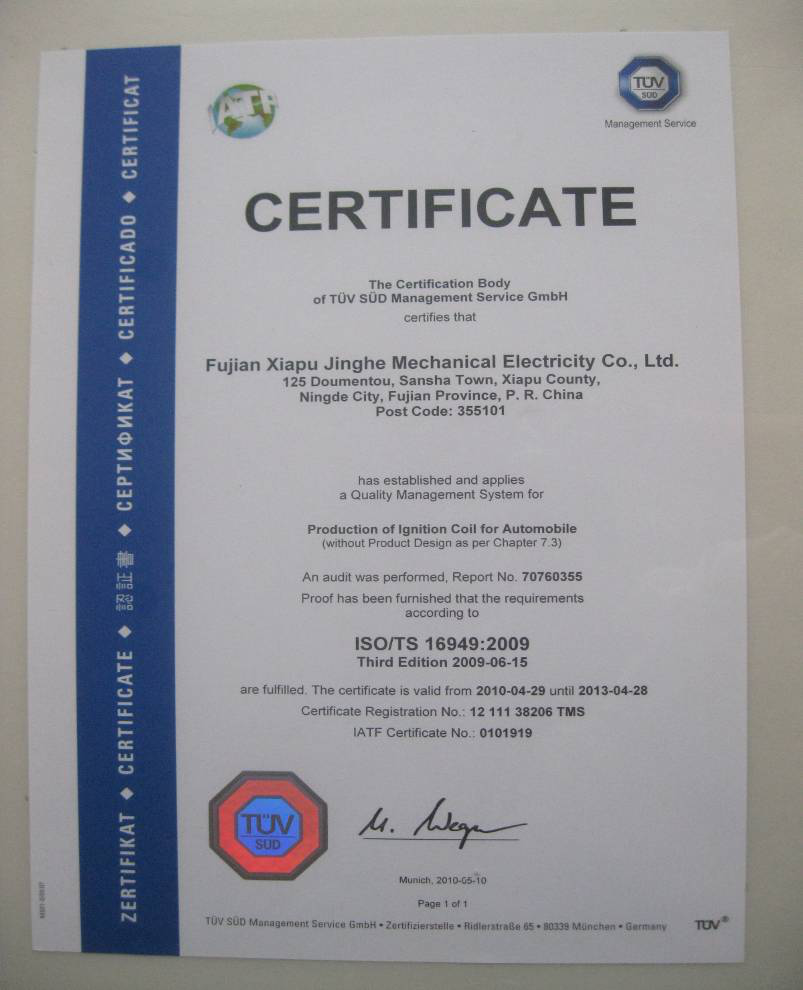 Fujian xiapu jinghe electromechanical co., ltd. is located in sansha town, xiapu county, ningde city, fujian province. The company specializes in the production of automotive dry high-energy ignition coil products. Founded in 2001, the company has 17 years of practice, the company's area of 8,000 square meters, the total assets of more than 30 million yuan .The company has a complete product chain integrating precision mold processing, plastic parts injection molding, automobile electronic module and ignition coil finished product processing and detection, which has advantages of short development and production cycle, quality control and rapid market response. Adhering to the "people-oriented" management belief, the company has gathered a number of outstanding technical and management personnel with solid technical foundation and rich experience. Create a hard, positive, dedicated, proud of dedication to the enterprise culture. The company pays attention to the product quality and the equipment investment, satisfies the market new product, provides the reliable quality for the customer. The company always strives for the survival by the quality, the science and technology strives for the development, pursues "the quality first, the customer first, the prestige first" the enterprise objective, wholeheartedly provides the high quality product and the fine service for the overseas customer.