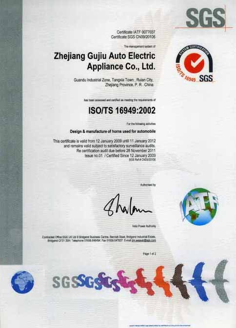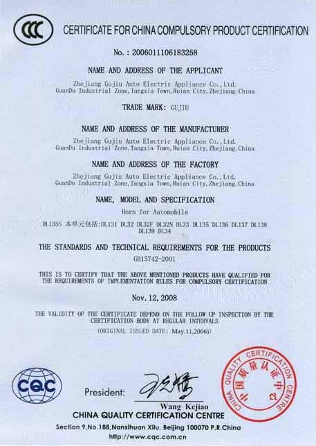 GuJiu Auto Electric Appliance Co., Ltd., a corporate enterprise, was estiblished on 1991. It specializes in production of auto horns. It is also an ISO/TS16949 international quality system authentication enterprise, owing advanced production technology and equipment and scientific management system, perfect customer service system. Through many years of hard woking and developing, the quality and technology of our products are at the leading position in the colleague. The prominent trademark, “Gu Jiu”, wins the majority of users trust and praise with the reliable quality and good after-sales service. GUJIU company has three major series products such as the snail electric horns, disc type electric horns, electric control air horns as the leading. Our products are exported to Europe, America, Middle east and so on.